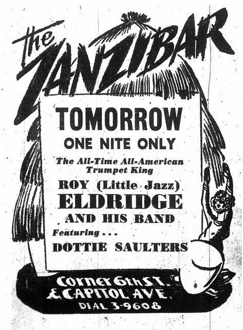 In July 1948, Atkins tours with Coles – but without Dotty - in Great Britain and returns in September. For some time, when she has no gig in Philadelphia, Dottie Saulters accompanies trumpeter Roy Eldridge and his quintet. One can hear her at Sacramento’s Zanzibar and spend eves with them at Club 86 in Geneva, NY. At this time, they are under contract with MCA that organizes packages of artists.