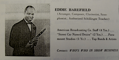 At the time of this recording (and tour), Eddie Barefield is also a studio musician, especially for NBC-TV; he runs a Broadway pit orchestra (for A Streetcar named Desire); he also gives saxophone lessons.