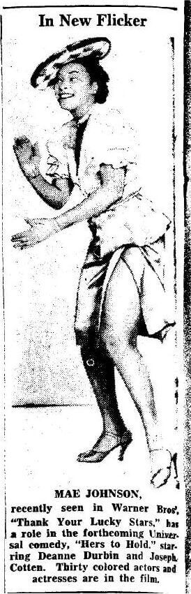 The year 1943 would prove to be a career high point for Mae Johnson. She had permanently moved to the Los Angeles area and started the year by entertaining the soldiers. One major African American troupe that performed at San Bernardino included Mae along with stars Hattie McDaniel, Clarence Muse, Ernest Whitman and Mantan Moreland.