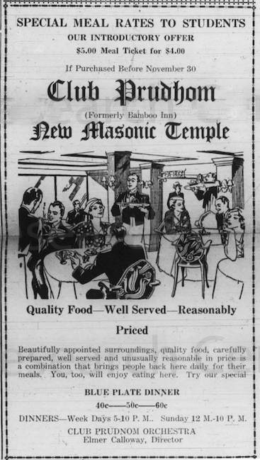 A large electric sign outside, located inside the Masonic Temple Building, Club Prudhom was considered the “first venture of its kind in the District of Columbia”. The “night club offering a floor show and has patronage of all races. It employs 60 people and has a payroll of more than $1,000 a week. Almost nightly it is filled to capacity and crowds line the street waiting to get in.” (Afro American, December 26, 1931).