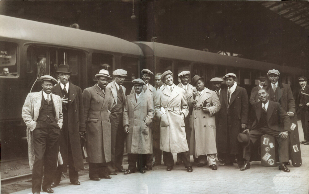 The whole Cab Calloway band, arriving in Paris, April 1934. Everybody looks sharp.