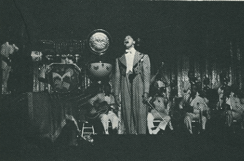 Cab Calloway probably on the stage of the Apollo with a larger angle on the orchestra.