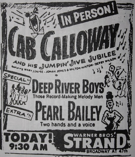 April 16, 1948: Cab in person at the Strand Jean-François Pitet 04-16-2025 new york Tweeter En plus de Pearl BAILEY (décrite par un élégant "2 mains et une voix"), Cab Calloway est entouré des Deep River Boys, de Mary Louise, Milt Hinton et Jonah Jones et Derby Wilson. Please enable JavaScript to view the comments powered by Disqus. blog comments powered by Disqus